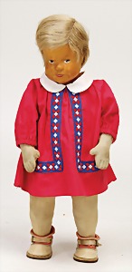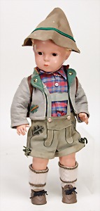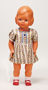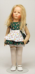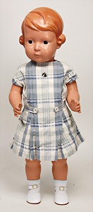 Mädchen, Stoffkopf, deutlich sichtbare Hinterkopfnaht, braune gemalte Augen, kl. Farbabplatzer an Stirn u. rechtem Augenwinkel, 2 Linien rechts u. links am Mund, Echthaar-Perücke, Stoffkörper mit abgenähten Kniekehlen, 45 cm