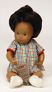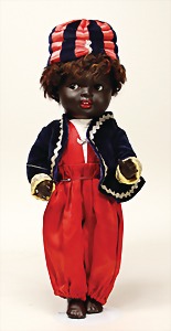 Masse-Puppe, braune Schelmen-Augen, off. Mund, 2 Zähne oben, fest aufgeklebte Echthaar-Perücke, von außen keine Risse erkennbar, bitte Transportrisiko für Augenmechanismus beachten, auf Masse-Stehkörper, mit Stimme, 40 cm, als Sarrotti-Mohr gekleidet