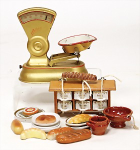 Ausschmückungsteile für Kaufladen o. Küche, 1 Waage, Blech, gem. ANSOE, kl. Wandregal mit 6 Porzellan-Schütten, einige Schaugerichte und Porzellanteile