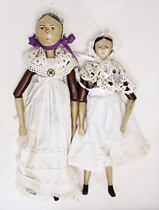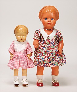 2x Gretchen, fester Kopf, 1x mit braunen Augen, 26 cm, 1x mit blauen Augen, 35 cm, bewegl. Arme u. Beine, guter Zust.