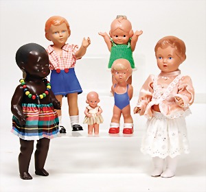 6 Puppen, 1x Mambi, fester Kopf, gem. 27 ½, Christel, Tortulon, 24 ½, Kewpie, 17 ½, Ursel, neuer, 29 cm, 1 Rassel, Tortulon, Mädchen im Badeanzug, gem. 17, kl. Kunststoff-Mädchen, gem. 9