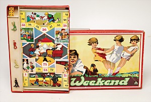 Würfelspiel, Weekend, Klee Verlag, Fürth, Spiel für Dänemark, mit 4 Zinnfiguren, mit Spielplan u. Anleitung, im Orig.-Kart.