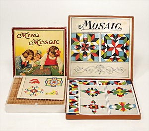 2 alte Mosaic-Spiele, 1x gem. MIRA, von Hausser, ca. 1925, 1x lackierte Holzteile, mit Vorlagen, alles im Orig.-Kart.