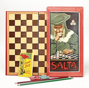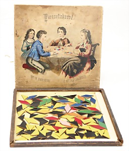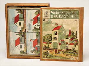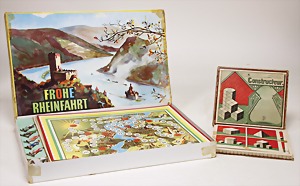 Gesellschaftsspiel, 1x Frohe Rheinfahrt, Abel-Klinger Verlag, Nürnberg, mit 5 großen Zinn-Figuren, im Orig.-Kart. Deckel an den Kanten eingerissen, 1x Der kleine Constructeur, von C.Brandt, Lößnitz, ca. 1900, mit Vorlagen, nicht kompl., im Orig.-Kart.