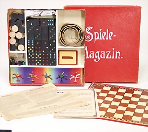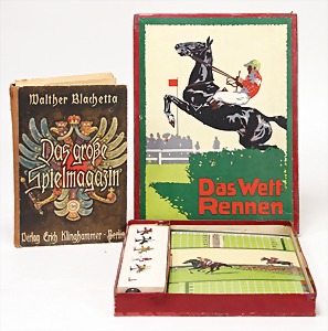 Das Wett-Rennen, Spiel von Hausser, Ludwigsburg, um 1911, mit 5 Zinnfiguren, 6. Figur fehlt, im Orig.-Kart., dazu "Das große Spielmagazin", von W. Blachetta, Buch mit 39 Spielen u. sämtlichem Zubehör, von 1942