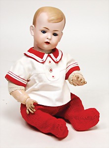 Porzellan-Vollkopf-Junge, gem. 2048 3, Kopf restauriert, blaue fest eingesetzte Glasaugen, off. Mund, 2 Zähne oben, Masse-Sitzbabykörper mit abstehendem Zeh, 2 Finger geklebt, 36 cm