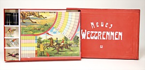 Spiel, Neues Wettrennen, Verlag Klee, Fürth, mit 6 gr. Zinn-Pferden u. viel Zubehör, im Orig.-Kart., kompl., Deckel an 1 Ecke eingerissen