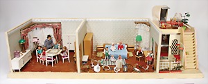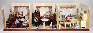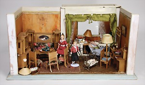 3-tlg. Puppenstube, 8 x 38 x 31 cm, 3 verglaste Fenster zum Öffnen, 2 Durchgangstüren, kompl. eingerichtet mit Wohn- Ess- u. Küchen-Mobiliar, reichh. Zubehör, dazu schönes Konv. Puppenstuben-Puppen (Biegepuppen)