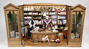 Puppenstuben-Gehäuse, 85 x 50 x 45 cm, als Stoffladen eingerichtet, mit 2 verglasten Schaufenstern, 1 Glas gebrochen, mit reichh. Zubehör, Stoffballen, Nähutensilien