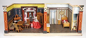 2-tlg. Puppenstube, 1,10 m x 44 cm x 40 cm, 3 verglaste Fenster zum Öffnen, Durchgangstür, mit reichh. Wohnzimmer-Mobiliar, Gründerzeit, Couch, 2 Sessel, Klavier, Kommoden, Schlafzimmer, 2 Betten, Nachttisch, Spiegel-Kommode, Waschtisch, Kleiderschrank, reichh. Zubehör (Kleinteile), 5 Porzellan-Puppen