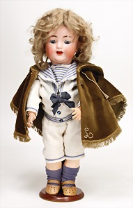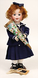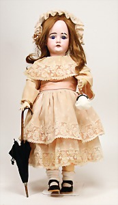 Porzellan-Brustblattkopf-Puppe, 294 Dep II, blaue Schlafaugen, geschl. Mund, durchst. Ohren, Mohair-Perücke, auf Wachstuch-Körper, Masse-Unterarme, 56 cm, Kleidung nachgenäht, Wachstuch-Schuhe, dazu 1 Puppenschirm