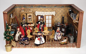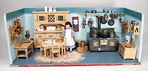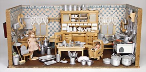 Puppen-Küche, 62 x 38 x 31 cm, mit Fenster zum Öffnen, alte Tapete, mit Einrichtung u. reichh. Zubehör (Blech, Zinn u. Glas), Geschirr-Schrank, Wandbord, kl. Blech-Herd, Waschbecken, Masse-Trachtenpuppen, Alter?