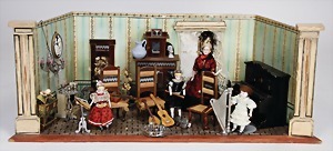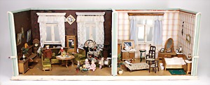 2-tlg. Puppenstube, mit Erker, gr. Fenster im Erker zum Öffnen, 84 x 40 x 34 cm, bemalte Wohnzimmer-Tapete, Wohn- u. Schlafzimmer-Mobiliar, Gründerzeit, 2 Porzellan-Puppenstuben-Puppen