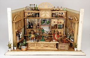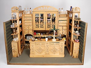 Apotheke, 70 x 49 x 41 cm, mit Schrank, Regalen u. Theke (Laubsägearbeit), dazu reichh. Zubehör, Spanschachteln, Dosen, Gläser, Porzellan-Behälter