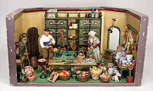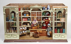 Kaufladen, 66 x 34 x 39 cm, mit fest eingebauten Regalen, Theke, reichh. Zubehör, Flaschen, Gläser, Zinnteile, dazu 2 Stoff-Figuren (Karikaturen) mit geschnitzten Holz-Köpfen