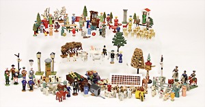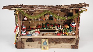 Weihnachts-Marktstand, Holz, Bastelarbeit, 38 cm, Dach aus Baumrinde, mit reichh. Zubehör, meist Erzgebirge-Figuren u. Fahrzeuge
