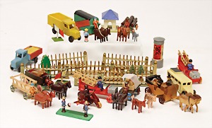 gr. Konv. Figuren u. Tiere, dazu 2 Fahrzeuge mit Zinnrädern, Motorrad mit Seitenwagen u. v. m., bitte besichtigen