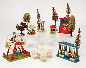 Riesenrad, H: 14 cm, Schiffschaukel, kl. Schaukel, 1 Zeitungs- u. Marktstand, kl. Kasperle-Theater, dazu einige Bäume, kl. runder Tisch mit 4 passenden Stühlen, 50er Jahre