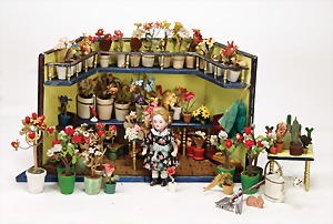 kl. Blumenladen, 29 x 11 x 15 cm, Alter?, mit reichh. Zubehör, Blumentöpfe mit Stoffblumen, dazu kl. Porzellan-Ganzbiskuit-Puppe