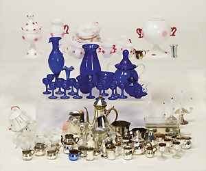 schönes Konv. Puppenstuben-Glasgeschirr, versch. Farben u. Ausformungen, u.a. auch mit Silber, 1 Kronleuchter mit 3 Kerzen, 1 kl. Aquarium, Kunststoff