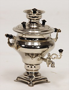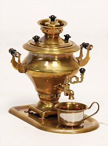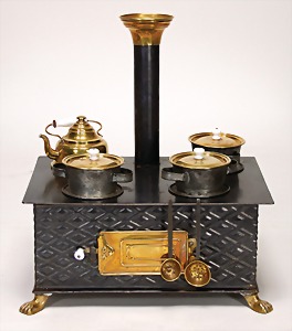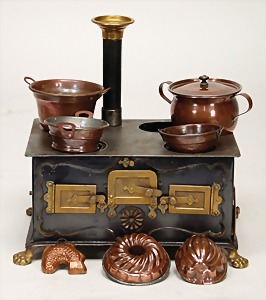 Puppen-Herd, Blech, mit Messing-Ofentür u. Löwentatzenfüßen, 27 x 13 x 20 cm, mit Topfsatz, Deckel u. Wasserkocher Messing mit Porzellan-Knöpfen