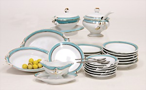 Puppen-Speiseservice, Porzellan, ungem., 18 große u. kl. Teller, Suppenterrine, H: 9 cm, Suppenkelle gebrochen, 1 Sauciere, 1 Terrine, 2 Platten