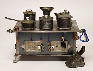 Puppen-Herd, Blech, 26x19x14 cm, 2 Ofentüren, Löwentatzenfüße, Topfsatz, 3 Knaufe fehlen, dazu kl. Kohlenschütte