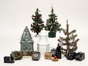 2 Puppenstuben-Öfen, 1x Keramik, H: 20 cm, 1x Porzellan, H: 18 cm, dazu 6 Kohleschütten, Blech lithogr., 3 Puppenstuben-Weihnachtsbäume, geschmückt, Alter?