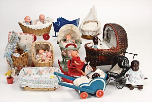 Konv. Puppenstuben-Wiegen u. Puppenwagen, Korb u. Holz, mit einigen Masse- u. Celluloid-Püppchen