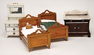 2 Puppen-Betten, Holz, 23 cm, mit Bettzeug, dazu 2 Kommoden, 1x mit Marmorplatte, nicht dazu passend, kl. Porzellan-Brustblattkopf-Puppe, mit Stoffkörper