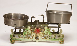 Storchenschnabel- Kaufladen-Waage, Guss, handbemalt, 21 cm, Waagschalen mit altersbed. Roststellen