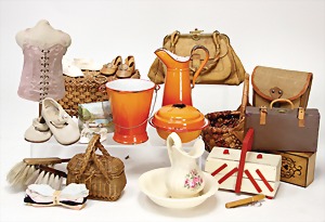 schönes Konv. Puppen-Ausschmückungsteile, darunter Waschschüssel, Blech emailliert, mit passendem Eimer u. Kanne, altersbed. Emaille-Abplatzer, Waschschüssel mit Kanne, Porzellan, 3 Puppenkörbe, 1x gefüllt mit 4 Paar Puppenschuhen u. 2 alte Handfeger, 1 Nähkästchen, 1 Schneiderbüste, bitte besichtigen