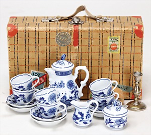 Puppen-Kaffeeservice, Porzellan, blaues Blumenmotiv, Kaffeekanne, H: 9 cm, Tassen, Untertassen, Milchkännchen, Zuckerdose, versilberter Kerzenständer, alles in altem Puppenkoffer