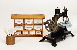 Puppenküchen-Gewürzständer, Holz, mit 10 Porzellan-Schütten, dazu 1 Kinder-Nähmaschine, Blech lithogr., 1 kl. Korb, mit Bein-Zahnstochern