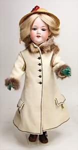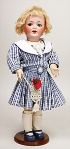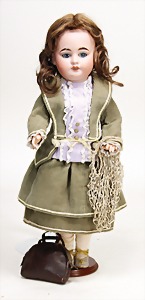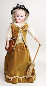 Porzellankopf-Puppe, gem. AS.7½, blaue fest eingesetzte Glasaugen, off. Mund, Zähne oben, Kinngrübchen, Brandlinie hinter dem linken Ohr, neue Echthaar-Perücke, auf Masse-Gliederkörper, mit Kugelgelenken, 54 cm, Kleidung aus alten Stoffen nachgenäht, dazu kl. Puppen-Schirm und kl. Tasche