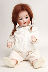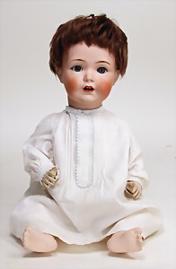 Porzellankopf-Puppe, gem. 122 Germany 50, blaue nachtr. fest eingesetzte Glasaugen, off. Mund, 2 Zähne oben, Zunge, Echthaar-Perücke, auf Masse-Sitzbabykörper, 1 Finger weggebrochen, 1 Zeh bestoßen, Gummi etwas lose, muss neu aufgezogen werden