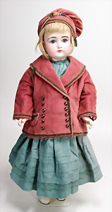 Porzellankopf-Puppe, gem. 1894 Dep, blaue fest eingesetzte Glasaugen, off. Mund, Zähne, Echthaar-Perücke, auf Masse-Gliederkörper, 42 cm, Kleidung nachgenäht