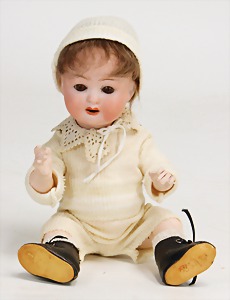 Porzellankopf-Puppe, gem. Simon & Halbig 156/12, blaue Schelmen-Augen, off. Mund, 2 Zähne oben, Zunge, Echthaar-Perücke, auf Masse-Sitzbabykörper, mit abstehendem Zeh, Arme u. Beine überstrichen, 60 cm, alte Kleidung u. Lederschuhe