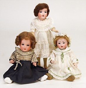 3 Porzellankopf-Puppen, 2x Armand Marseille, gem. 390, blaue Schlafaugen, off. Mund, Zähne, Echthaar-Perücke, Masse-Sitzbaby-Körper, 22 cm, 1x blaue fest eingesetzte Glasaugen, off. Mund, Zähne, aufgeklebte Mohair-Perücke, auf Masse-Stehkörper, mit anmodell. Schuhen und Strümpfen, 24 cm, 1x Porzellanfabrik Mengersgereuth, gem. Germany 23, blaue Schlafaugen, off. Mund, 2 Zähne oben, Mohair-Perücke, Masse-Sitzbabykörper, 20 cm