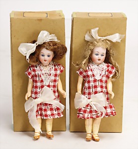 2 Porzellan-Puppenstuben-Puppen, gem. Germany Herm. Steiner 22, blaue fest eingesetzte Glasaugen, off. Mund, Kunsthaar-Perücken, auf Masse-Stehkörper, mit anmodell. Schuhen u. Strümpfen, bespielt, im Orig.-Kart., 15 cm
