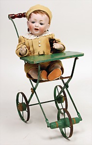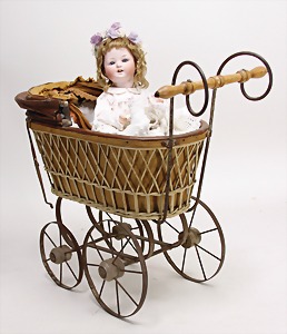 Porzellankopf-Puppe, gem. Grete 1, blaue nachtr. fest eingesetzte Glasaugen, off. Mund, 2 Zähne oben, Echthaar-Perücke, auf Masse-Sitzbabykörper, mit abstehendem Zeh, 32 cm, Farbe etwas abgerieben, Fingerspitzen bestoßen, dazu 1 Puppenwagen-Korb, Guss-Speichenräder, Wachstuch-Verdeck