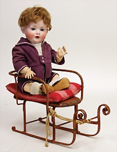 Porzellan-Vollkopf-Baby, gem. BSW im Herz, blaue Schlafaugen, off. Mund, auf Masse-Sitzbabykörper, mit abstehendem Zeh, 38 cm, Kleidung, nachgenäht, alte Wachstuch-Schuhe, dazu 1 Echthaar-Perücke, 1 Puppen-Holzschlitten, mit Metall-Kufen, Alter?