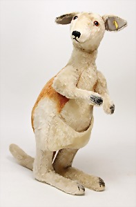 Känguru, mit Knopf und Fahne, Nr. 4385,00, 60 cm, Junges fehlt, bewegl. Kopf u. Arme, bespielt
