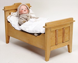 Porzellan-Einbindekopf-Baby, Vollkopf, gem. Germany 352, blaue Schlafaugen, off. Mund, 2 Zähne oben, auf Stoffkörper, Masse-Hände, 34 cm, dazu 1 Puppen-Bett, Holz, mit Bettzeug, L: 46 cm