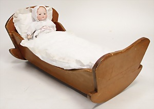 Porzellan-Einbindekopf-Baby, Vollkopf, gem. Germany 341, blaue Schlafaugen, geschl. Mund, Stoffkörper, Masse-Arme, 30 cm, Kleidung aus alten Stoffen nachgenäht, dazu 1 Puppen-Wiege, Holz, mit Bettzeug, L: 56 cm