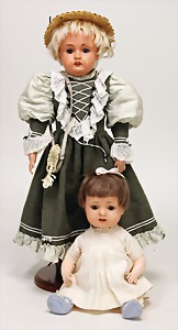 2 Celluloid-Puppen, 1x Bruno Schmidt, gem. 30, braune Schlafaugen, off, Mund, 2 Zähne oben, Mohair-Perücke aufgeklebt, auf Masse-Sitzbabykörper. 30 cm, 1x J.D.K., Celluloid-Brustblattkopf-Puppe, gem. 201.3, braune fest eingesetzte Glasaugen, off. Mund, Zähne, Wachstuch-Körper, Celluloid-Unterarme, Unterschenkel Stoff, 44 cm, Kleidung nachgenäht