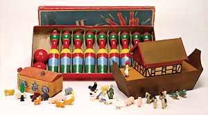 Altes Kegelspiel, Holz, bemalt, Kegel 14 cm, mit 2 Holz-Kugeln, im Orig.-Kart., dazu 2 kl. Holz-Archen, 1x mit Reifentieren, 1x neuere Produktion, mit gr. Konv. handbemalten Holz-Tieren