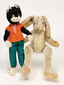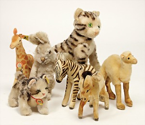 7-tlg., 2x Kitty, 1x mit Knopf, Schild, u. Fahne Nr. 5310,00, 1x ohne Knopf, Schild u. Fahne, 1 Hase stehend, ca. 14 cm, ohne Knopf, Schild u. Fahne, 3 Samt-Tiere, Giraffe mit Knopf, Schild u. Fahne Nr. 6414,00, 1 Dromedar