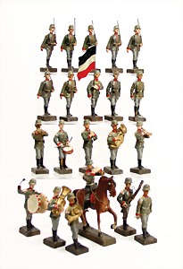 23-tlg., Masse, 8,5 cm, marschierend, Musiker, Fahnenträger, dazu 1 Reiter, meist Zust. 2-3