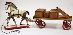 Wagen mit Zugpferd, um 1900, 66 cm, mit Ladegut, aus der Zeit, Pferd wohl teilw. 1x übermalt, Wagen orig., guter Zust.